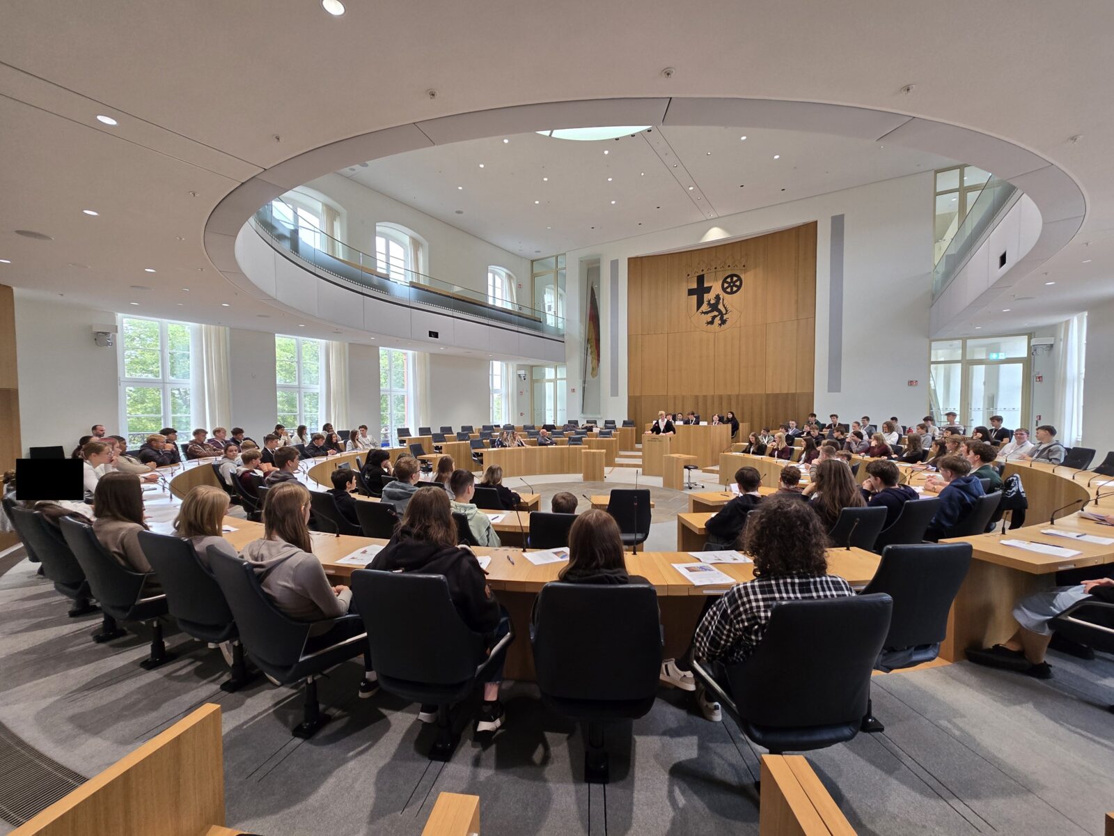 Daher haben die 10. Klassen sowie alle Sozialkundekurse der MSS 11 am 26.09.2025 den Landtag in Mainz besucht. Dort angekommen, ging es nach einer Sicherheitskontrolle gleich hinein in den politischen Alltag: Drei Fraktionen (Orange, Blau, Lila) wurden gebildet.