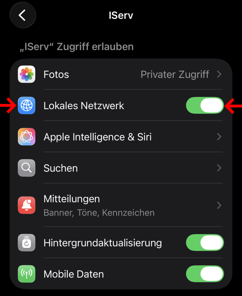 Dafür musst du im iOS-Menü Einstellungen->Apps->IServ der App den Zugriff aufs lokale Netzwerk erlauben, wenn du in der Schule bist: